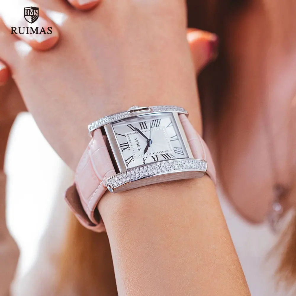 Promo RUIMAS Women Square Analog Automatic Watches Luxury Pink Leather Wristwatch Ladies Waterproof Mecha